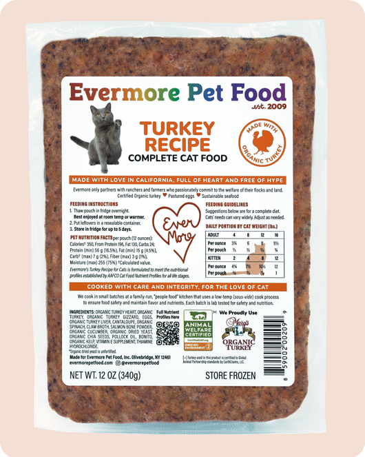 Our Turkey Recipe is formulated to be as delicious as it is nutritious, for cats of all ages. Sourced transparently from humane, quality ingredients, our gently cooked food is highly digestible and super palatable. Even the most finicky felines will pounce on this one!